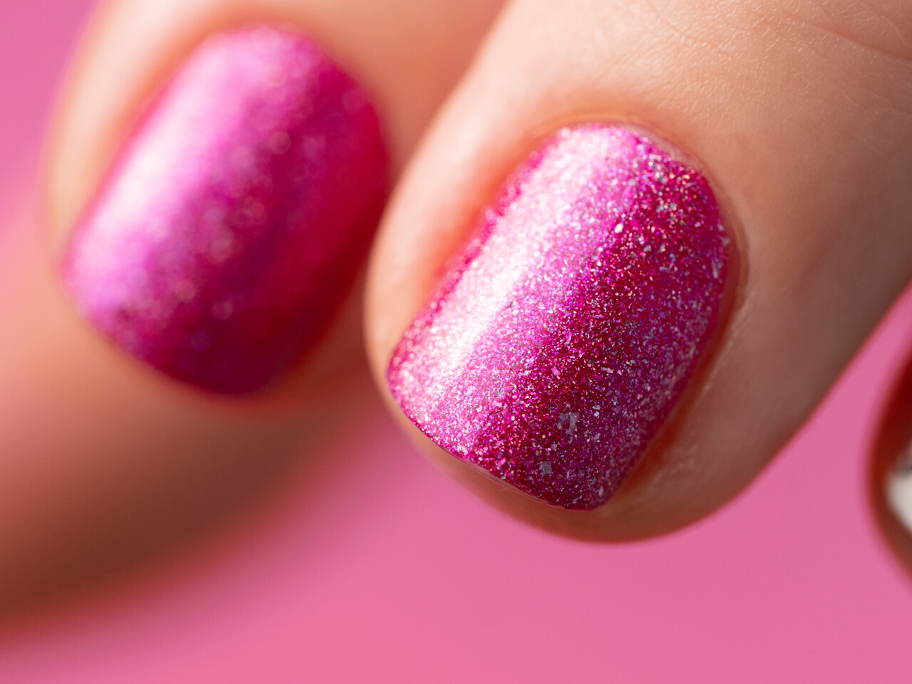 Różowe ombre z brokatem, które przechodzi z jasnego różu w intensywny fuksjowy.